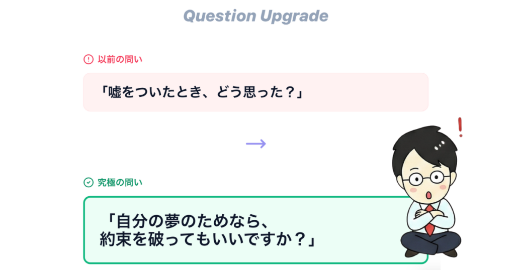 「約束を破った時、どんな気持ちでしたか?」「自分の夢のために約束を破るのは、許されることでしょうか?」