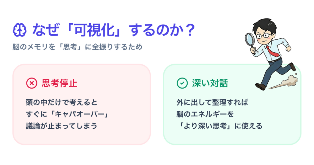 視覚的に情報を整理(可視化)することで、脳のエネルギーを「記憶」ではなく「思考」に使えるようになります。