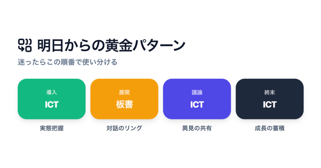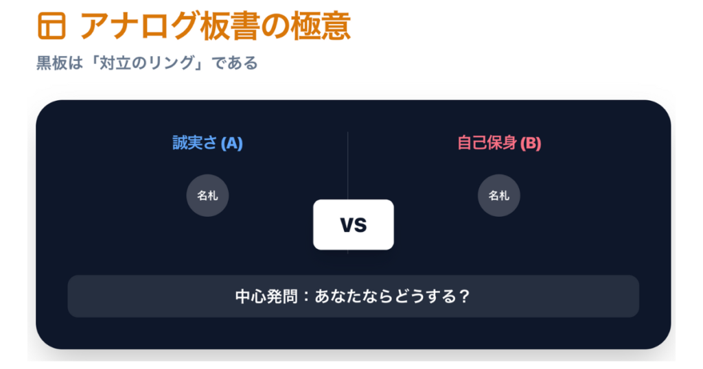 - 展開: 黒板で「A vs B」の対立構造を作り、ネームプレートを貼る(アナログ)