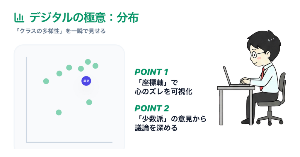 - 効果: 「みんなAだと思ったけど、意外とB寄りの人もいる!」と、クラスの多様性が一瞬で可視化されます。