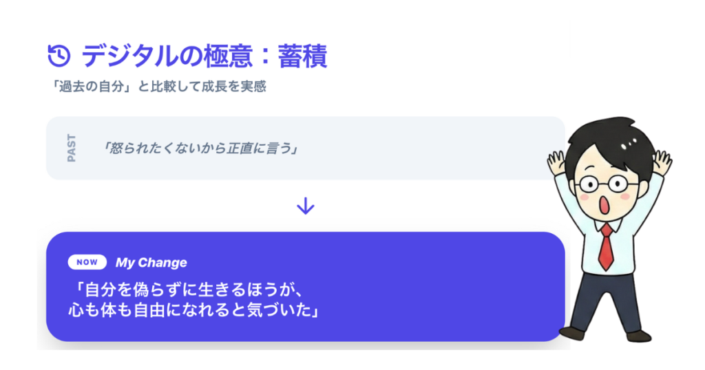 過去の自分の考えをいつでも見返せる状態にすることで、メタ認知能力が向上し、成長実感につながります。