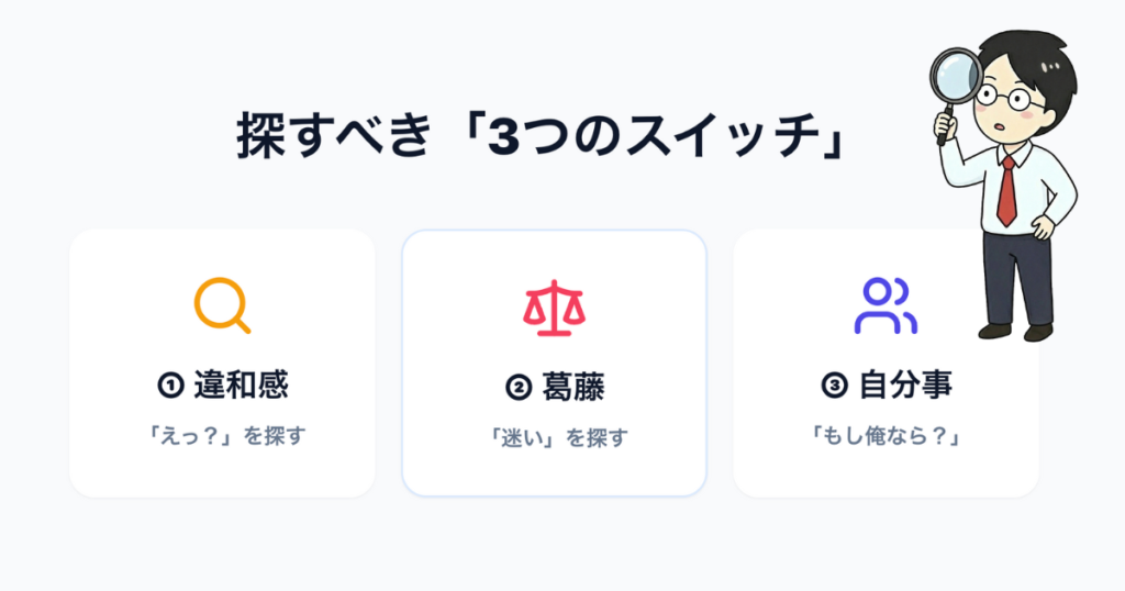「9つの視点」とか言われると覚えきれませんが、「違和感・葛藤・自分事」の3つなら、明日から探せそうな気がしませんか?
