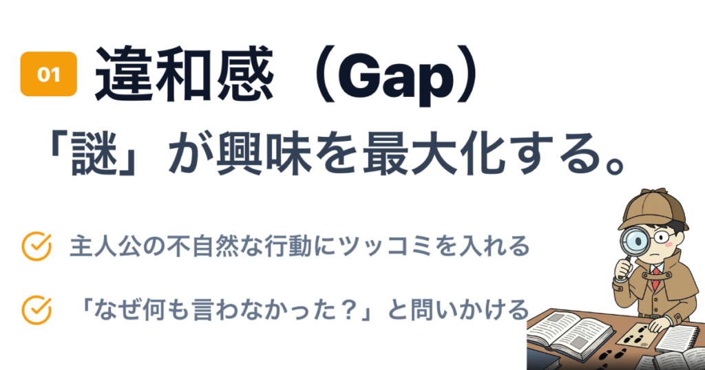 いわゆる「書かれていない空白」や「おかしな行動」ですね。