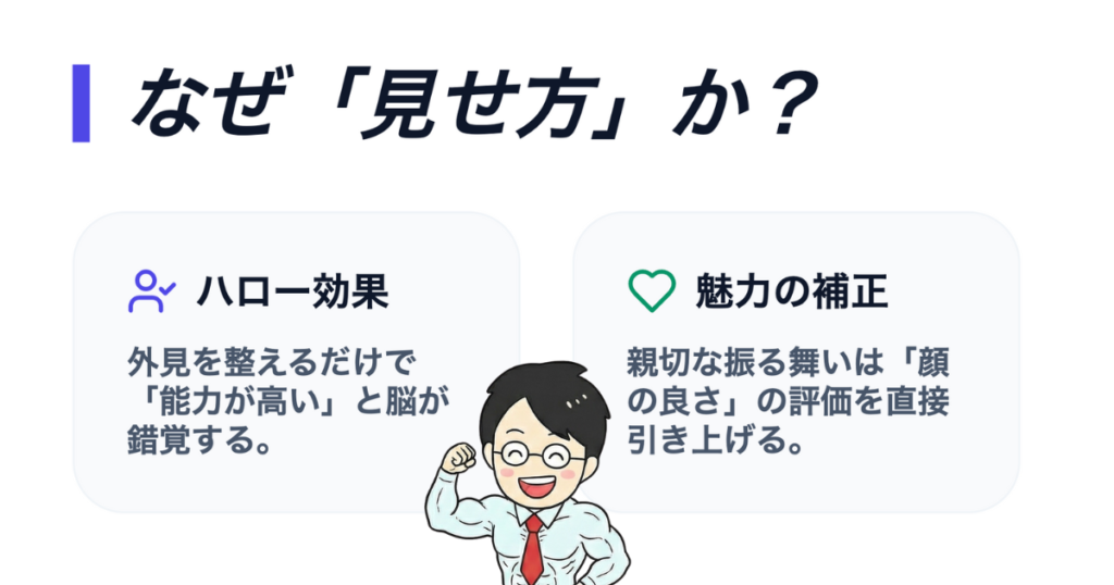 ざっくり対策を考えると、教員を目指す皆さんが彼らの「悪意」を真似る必要はありませんが、この「見せ方の技術」は盗めるんじゃないかと。つまり、「身だしなみを完璧にする」「自信満々に振る舞う(フリでもいい)」だけで、面接官の脳に「この人は能力が高そうだ(ハロー効果)」という錯覚を起こせる可能性があるわけです。